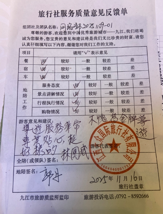 这份赞誉属于全程悉心相伴的导游团队——是他们在庐山云雾中为您撑伞引路,在景德镇窑火前娓娓道来千年瓷都故事,在婺源篁岭晒秋人家为您捕捉最美瞬间。