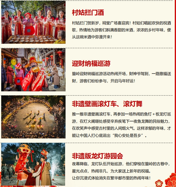 篁岭村推出“民俗过大年·闹新春”春节系列文旅活动,其中包括非遗表演、民俗演艺、乡愁体验等 30 余项活动,集中营造喜庆欢乐、祥和浓郁的新春氛围,让游客沉浸式体验“年味足、精彩多、趣味浓”的民俗盛宴。